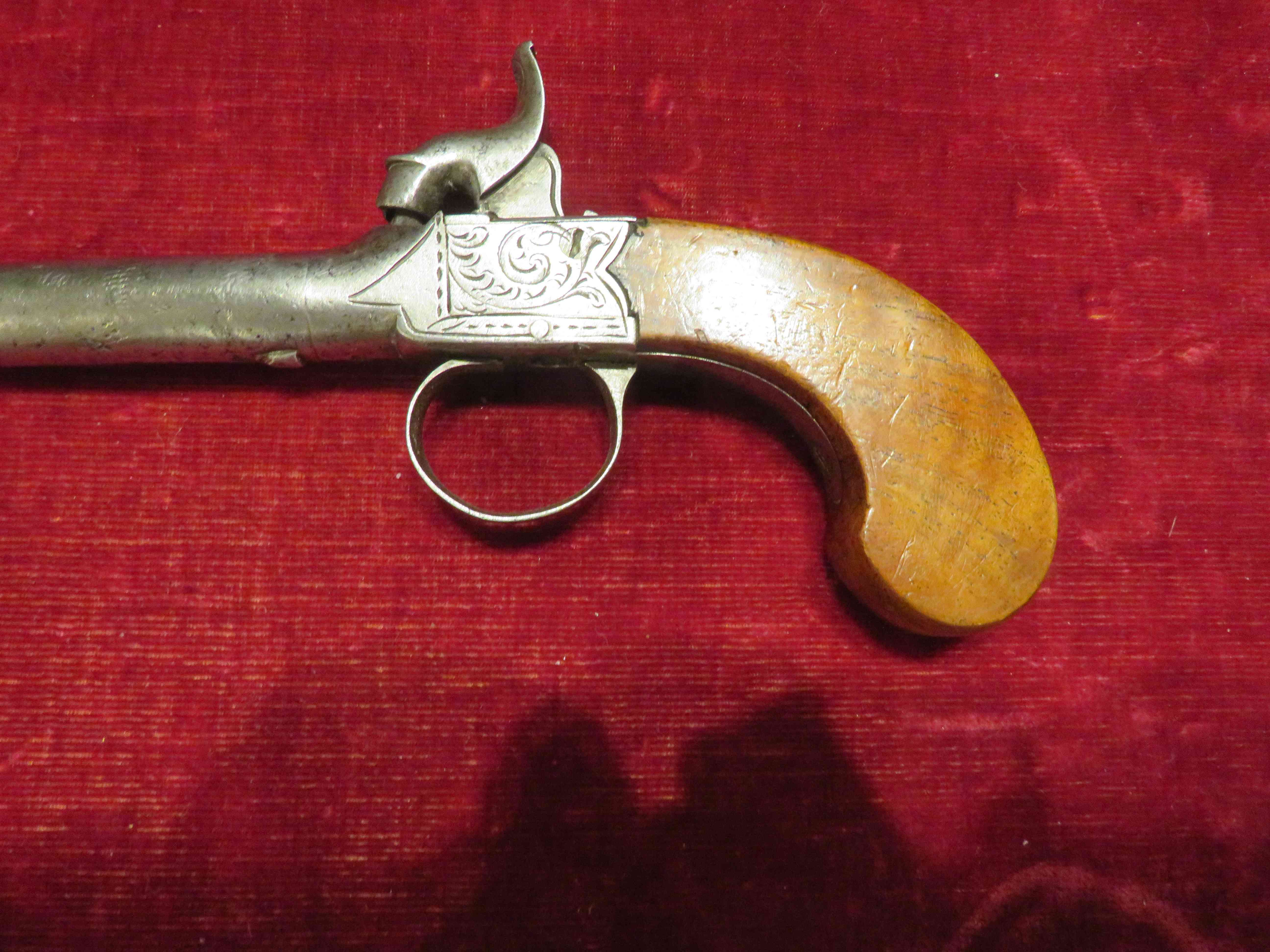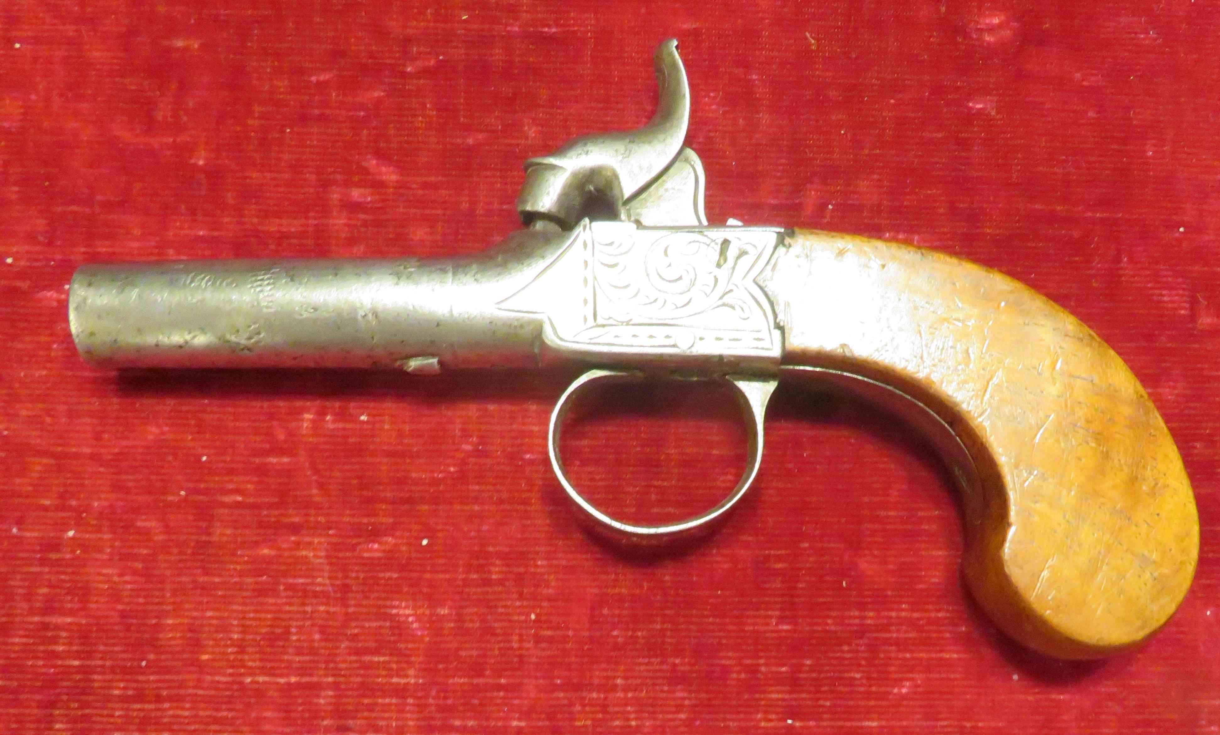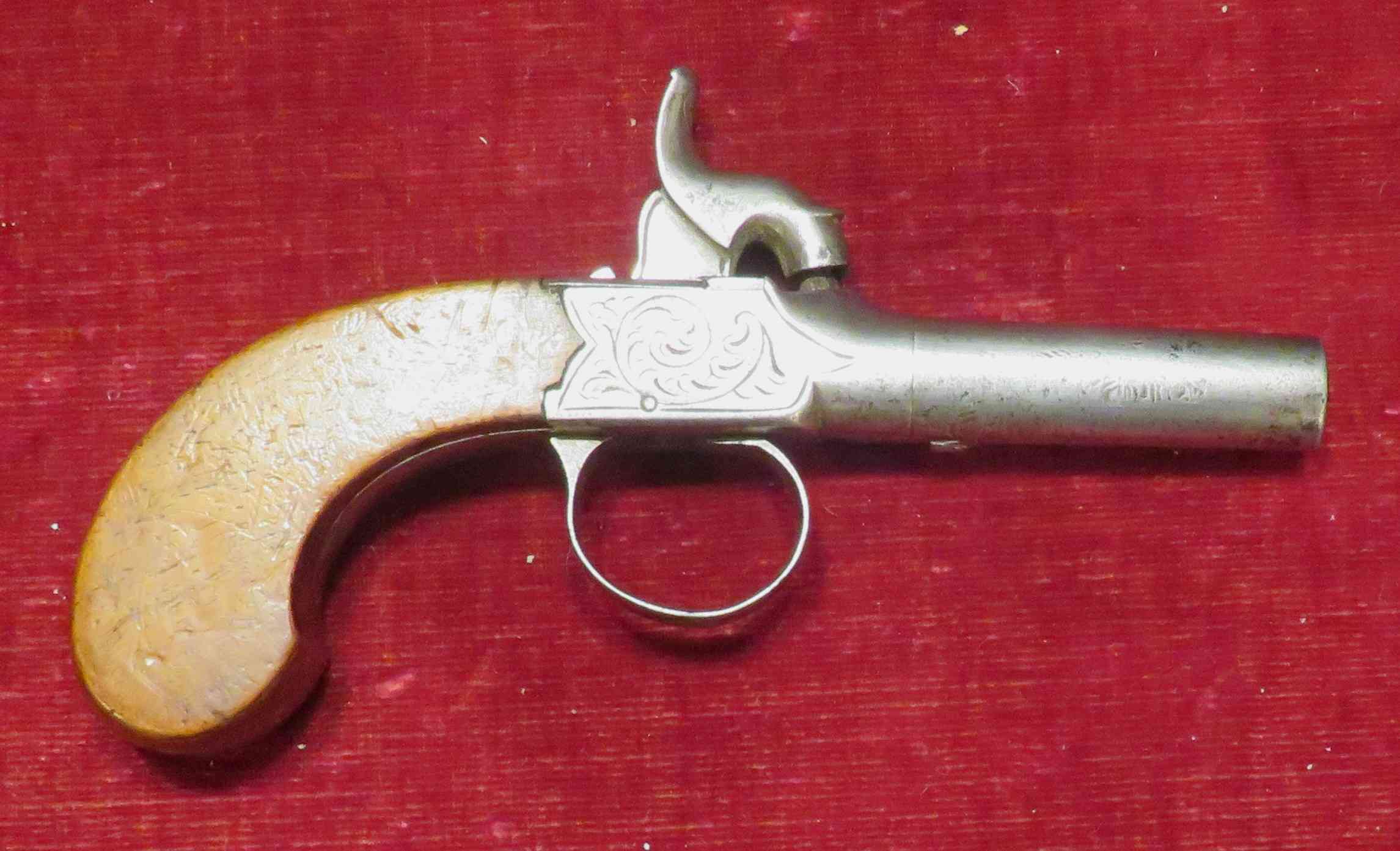 * An English Pocket Style Box Lock Percussion Pistol of an obsolete caliber so no license required to own this pistol.